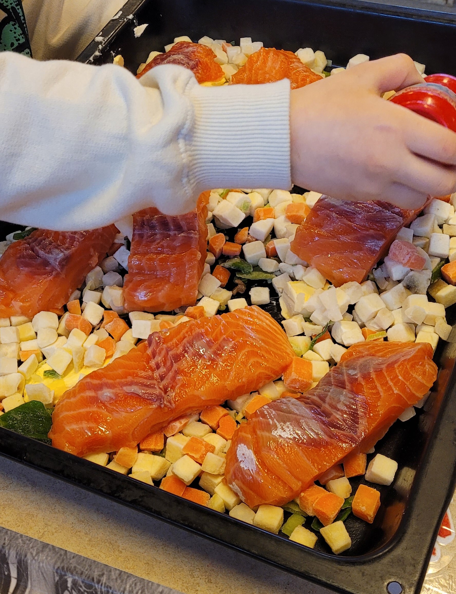 Márkomának barnehage var de første som satte tennene i laksen. Barna var med på å tilberede måltidet. Laksen ble delt i skiver og lagt på en eng av rotgrønnsaker, som ble stekt i ovnen. Nydelig mat som barna og de ansatte storkoset seg med.